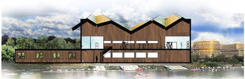 To accentuate those patterns within the space, the roof mimics the movement of water, as it creates a ripple effect when first in contact with the oars, and as it slowly fades out over time.