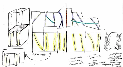 This conceptual project aimed to design a sustainable mountaintop lodge. The core spaces consisted of two cafes and a rooftop bar. Each space correlated to that of the mountains trails, when VOID and SPACE intersect they create pockets of environments.